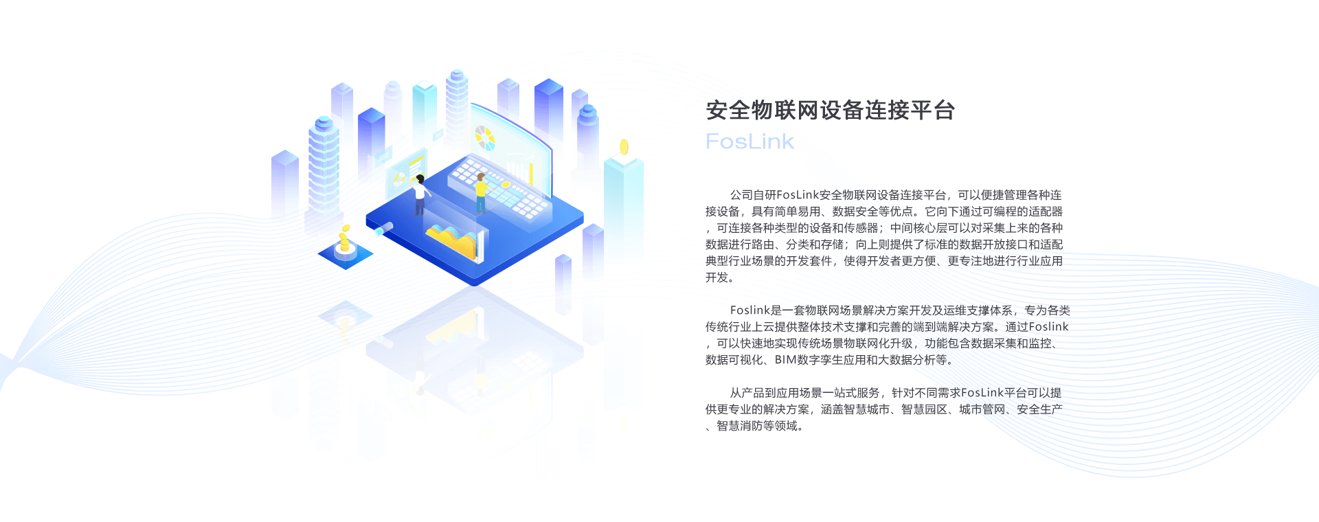 從產(chǎn)品到應用場景一站式服務,針對不同需求FosLink平臺可以提供更專業(yè)的解決方案,涵蓋智慧城市、智慧園區(qū)、城市管網(wǎng)、安全生產(chǎn)、智慧消防等領域。